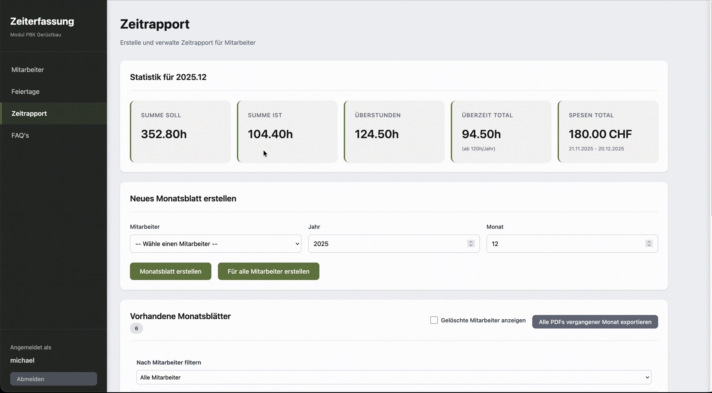 Eine professionelle Zeiterfassungs-Applikation für Gerüstbau-Unternehmen – GAV-kompatibel, mit automatischer Überstunden- und Überzeitberechnung sowie PBK-konformen Monatsblättern.